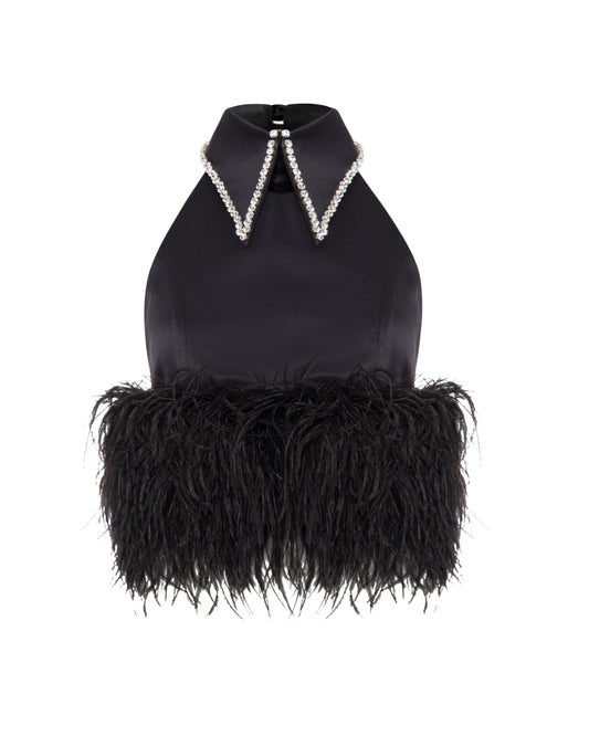 Fabric: Satin Material: Feathers & crystals Length: Mid-thigh Sleeve Length: Sleeveless Neck: Collared crystallized neckline...
